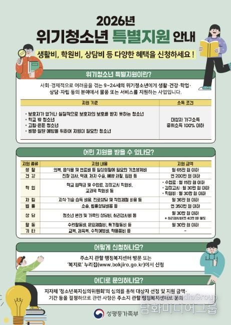 시민행정신문 강갑수 기자 | 가평군이 사회·경제적 어려움에 놓인 위기청소년을 대상으로 특별지원 신청을 이달 27일까지 받는다. 보호 기반이 취약한 청소년의 기본 생활을 지키고 학업 중단을 막기 위한 조치다.