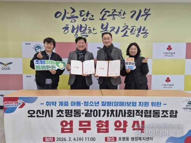 시민행정신문 강갑수 기자 | 오산시 초평동 행정복지센터는 지난 4일 지역 내 차상위계층 청소년과 아동의 건강한 성장 지원과 의료비 부담 완화를 위해 같이가치사회적협동조합과 질병(상해)보험료 지원을 위한 업무협약을 체결했다고 밝혔다.