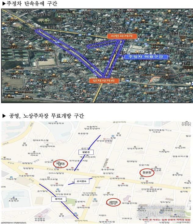 주정차 단속 유예 구간은 안성맞춤시장(서인사거리~인지사거리 구간 양측 300미터)과 중앙시장(서인사거리~안성농협 양측 100미터, 석정삼거리~인지사거리 양측 500미터) 주변 도로이며, 서인동·동본동·석정동의 건축식 공영주차장과 전통시장 주변 노상주차장이 무료 개방된다.