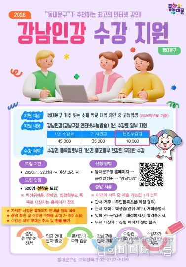 시민행정신문 강갑수 기자 | 서울 동대문구는 관내 중·고등학생의 사교육비 부담을 덜고 자기주도 학습 기반을 넓히기 위해 ‘강남인강(강남구청 인터넷수능방송) 수강 지원 사업’을 2026년에도 이어간다고 밝혔다.