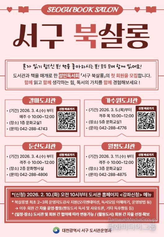 시민행정신문 강갑수 기자 | 대전 서구 4개 공공도서관(갈마, 가수원, 둔산, 월평)은 주민들을 대상으로 책과 도서관을 매개로 한 성인 독서회 ‘서구 북살롱’을 운영한다고 5일 전했다.