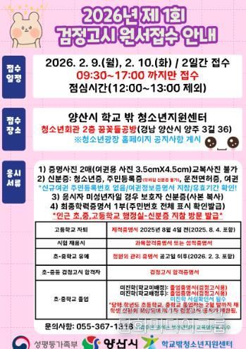 시민행정신문 강갑수 기자 | 양산시 학교 밖 청소년지원센터는 학교 밖 청소년들의 2026년 제1회 검정고시 응시를 지원하기 위해 대리 원서접수처를 운영한다.