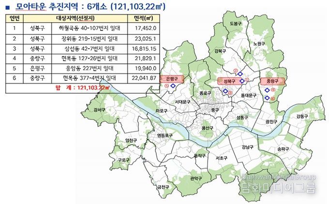 서울시는 2월 4일 제2차 도시계획위원회에서 주민제안 모아타운 신규 신청지역 6곳(성북구 3곳, 중랑구 2곳, 은평구 1곳)의 지목 도로를 토지거래허가구역으로 신규 지정했다고 밝혔다. 지정기간은 2월 17일부터 2031년 2월 16일까지 5년간이다.