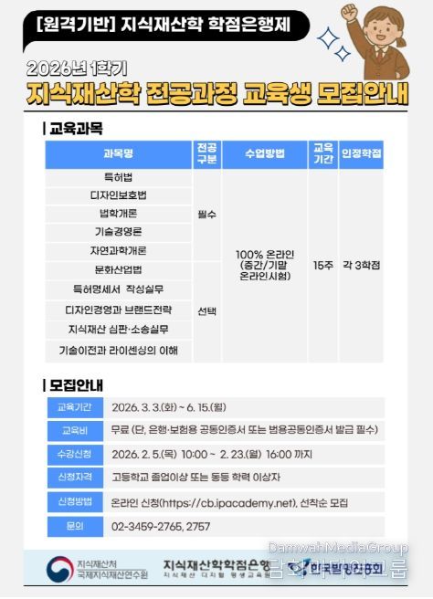 시민행정신문 김학영 기자 | 지식재산처 국제지식재산연수원은 한국발명진흥회와 공동으로 2월 5일부터 23일까지 지식재산학 학점은행 과정에 대한 온라인 수강생을 모집한다.