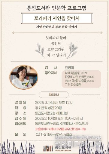 이번 강의는 2월 10일 오전 10시부터 통진도서관 누리집에서 신청할 수 있으며, 한하운 시인에 대해 관심 있는 청소년 및 성인 20명을 선착순으로 모집한다.
