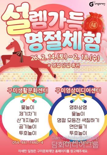 시민행정신문 기자 | (재)구미문화재단은 다가오는 설 연휴(2. 14. ~ 18.)를 맞아 구미생활문화센터와 구미영상미디어센터에서 시민과 귀성객을 위한 다채로운 문화 향유 프로그램을 운영한다고 밝혔다.