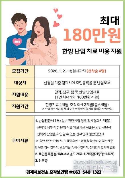 시민행정신문 강갑수 기자 | 김제시는 난임으로 어려움을 겪는 부부의 임신·출산을 지원하기 위해 2026년‘한방 난임부부 지원사업’을 추진한다고 밝혔다.
