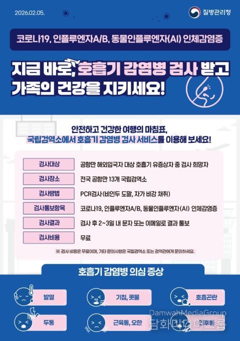시민행정신문 이존영 기자 | 질병관리청은 2026년 2월 10일부터 '여행자 호흡기 감염병 검사 서비스'를 전국 공항·항만 13개 검역소(12개 지소)로 확대하여 시행한다.
