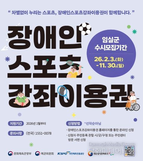 시민행정신문 장규호 기자 | 임실군은 지난 3일부터 장애인의 스포츠 참여 기회를 확대하기 위해 2026년 장애인 스포츠 강좌이용권 수시모집을 실시한다고 밝혔다.