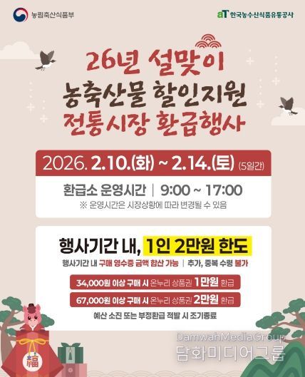 이번 행사는 농림축산식품부가 지원하는 2026년 설맞이 전통시장 소비 촉진 캠페인의 일환으로, 시민이 전통시장에서 국산 농축산물을 구매할 경우 구매 금액의 일부를 온누리상품권으로 환급해주는 방식이다.