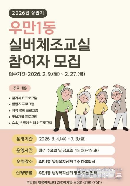 시민행정신문 강갑수 기자 | 수원시 팔달구 우만1동은 관내 어르신들의 건강 증진을 위해 2월 9일부터 2월 27일까지 ‘2026년 상반기 실버체조교실’ 참여자를 선착순으로 모집한다고 밝혔다.