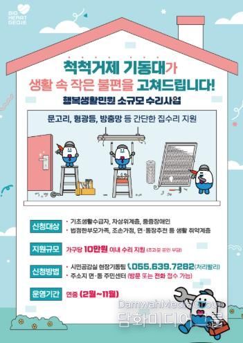 시민행정신문 강갑수 기자 | 거제시는 일상생활 속 소소하지만 해결이 어려운 불편을 겪고 있는 취약계층을 지원하기 위해 2026년 '척척거제 기동대 행복생활민원 소규모 수리사업'을 추진한다고 밝혔다.
