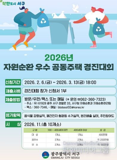 시민행정신문 김학영 기자 | 광주광역시 서구가 관내 100세대 이상 공동주택 204개소를 대상으로 ‘2026년 자원순환 우수 공동주택 경진대회’를 개최한다.