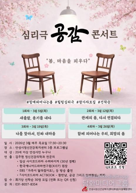 시민행정신문 기자 | 안성시보건소 안성시정신건강복지센터(부설 자살예방센터)는 시민의 정신건강 증진과 생명존중 문화 조성을 위해 심리극(사이코드라마) 기법을 활용한 체험형 집단 프로그램 '공감' 콘서트를 오는 3월 운영한다고 밝혔다.