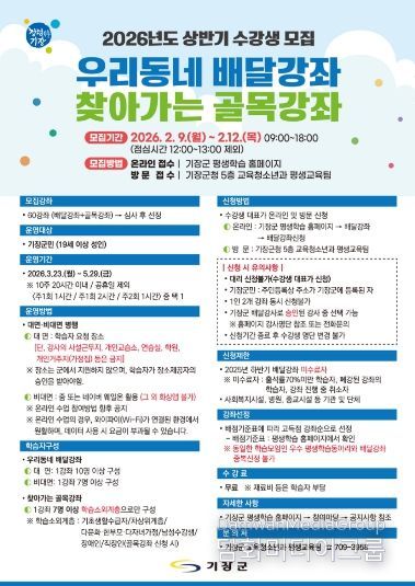 시민행정신문 강갑수 기자 | 기장군은 오는 2월 9일부터 12일까지 ‘상반기 우리동네 배달강좌 및 찾아가는 골목강좌’ 수강생을 모집한다고 6일 밝혔다.