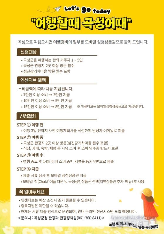시민행정신문 이세훈 기자 | 전남 곡성군이 여행 중 소비한 금액에 따라 최대 8만 원을 돌려주는 관광 인센티브 지원사업‘여행할때 곡성어때’를 운영한다고 6일 밝혔다.