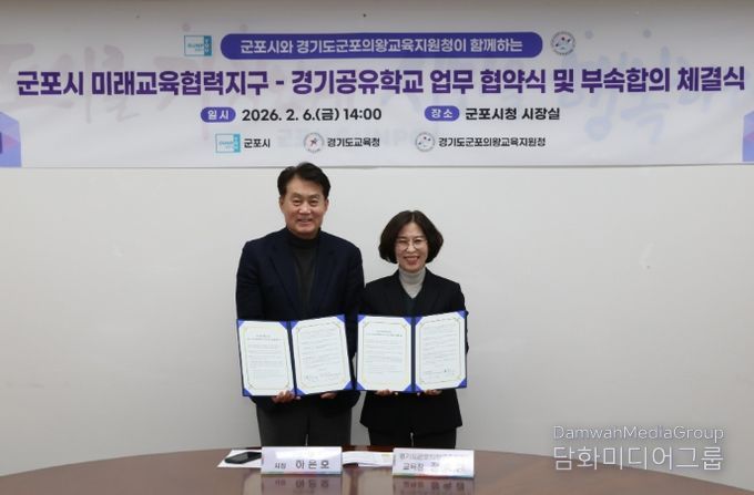 시민행정신문 기자 | 군포의왕교육지원청과 군포시청은 2월 6일 군포시청에서 '2026 군포시 미래교육협력지구-경기공유학교 업무협약식 및 부속합의서'를 체결했다.