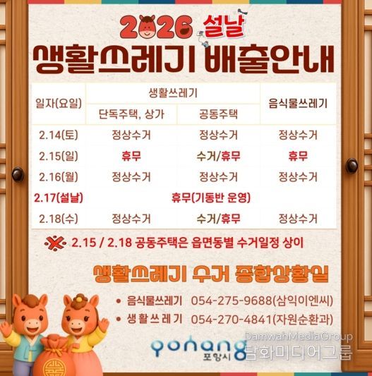 박재민 환경국장은 “설 연휴 동안 시민들이 쓰레기 문제로 불편함이 없도록 수거 체계를 빈틈없이 운영하겠다”며 “시민들께서도 정해진 배출 요일과 시간을 지켜 주시고, 음식물 쓰레기 줄이기와 올바른 분리배출에 적극 동참해 주시기를 당부드린다”고 말했다.