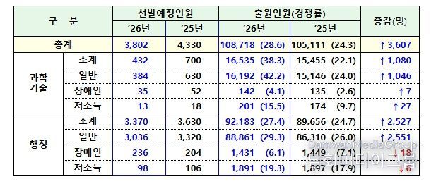 인사혁신처(처장 최동석)는 지난 2~6일 9급 공채 선발시험 응시원서를 접수한 결과 선발 예정 인원 3,802명에 10만 8,718명이 지원해 평균 28.6대 1의 경쟁률을 보였다고 7일 밝혔다.