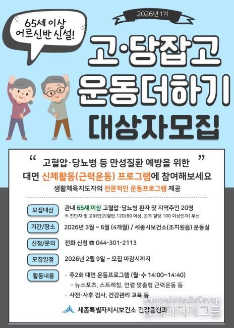 시민행정신문 기자 | 세종특별자치시보건소가 오는 3월부터 ‘2026년 고·당 잡고, 운동 더하기’ 사업 확대 운영을 통해 65세 이상 어르신을 위한 맞춤형 운동교실을 새롭게 개설한다고 밝혔다.