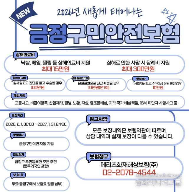 시민행정신문 강갑수 기자 | 부산 금정구는 2026년 2월 1일부터 구민의 일상 속 안전사고에 대비하기 위해 ‘2026년 금정구민안전보험’을 새롭게 운영한다고 밝혔다.