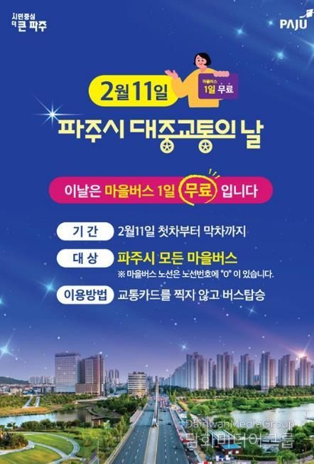 시민행정신문 강갑수 기자 | 파주시는 ‘대중교통의 날’을 맞아 대중교통 이용 활성화와 시민 교통비 부담 완화를 위해 오는 2월 11일 하루 동안 파주시 전 지역의 모든 마을버스를 무료로 운행한다.