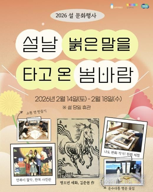 주요 프로그램으로는 한국 목판화 분야의 거장 김준권 작가의 ‘병오년 세화’를 활용한 ▲판화 체험이 마련된다. 작품 속 붉은 말의 힘찬 기운을 나만의 판화로 남길 수 있는 이 체험은 이번 행사의 대표 프로그램이다. 또한, 새해 운세를 점쳐보는 ▲행운 윷점, 올해 소망을 담은 ▲연 만들기, 명절의 특별한 추억을 남기는 ▲한복 체험 등 남녀노소 누구나 참여할 수 있는 다채로운 즐길 거리가 준비되어 있다.