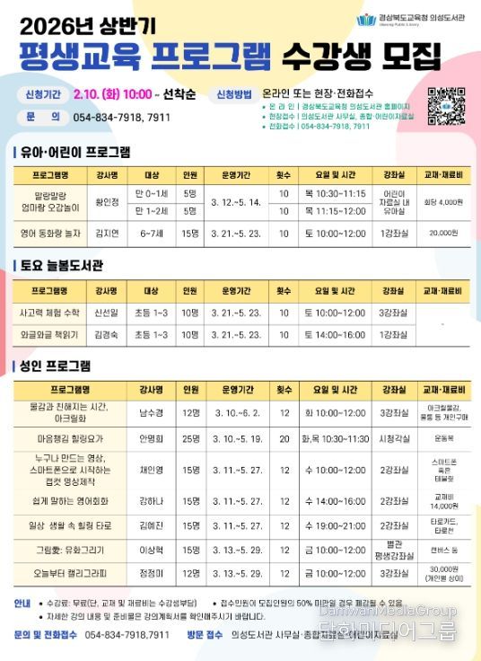 시민행정신문 기자 | 경상북도교육청 의성도서관은 지역주민의 평생학습 기회를 확대하고 삶의 질 향상을 도모하기 위해 2월 10일(화)부터 상반기 평생교육 프로그램 수강생을 모집한다고 밝혔다.