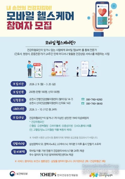 시민행정신문 강갑수 기자 | 순천시는 ICT 기반 공공형 건강관리서비스인 ‘2026년 보건소 모바일 헬스케어 사업’ 참여자를 모집한다고 밝혔다.