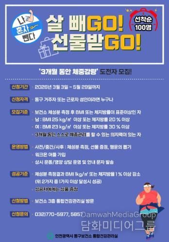 시민행정신문 조규호 기자 | 인천 동구보건소는 주민 스스로 건강한 체중 관리를 할 수 있도록 돕는‘나 혼자 뺀다! 살빼GO! 선물받GO!’프로그램 참여자를 모집한다고 밝혔다.