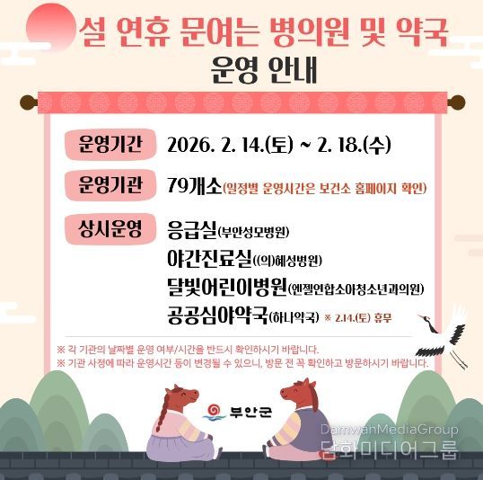 특히 지역응급의료기관인 부안성모병원은 24시간 응급실을 운영할 계획이며, 혜성병원은 야간진료실(09:00~17:00)을, 엔젤연합소아청소년과의원은 달빛어린이병원(10:00~18:00)으로 운영하며, 부안군보건소는 2. 17. 설날 당일에 진료를 실시할 예정이다