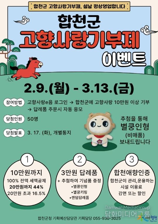 합천군 관계자는 “설 명절을 맞아 고향을 응원하는 마음을 기부로 표현할 수 있도록 이번 이벤트를 기획했다”며 “앞으로도 다양한 참여형 홍보와 체감도 높은 기금사업을 통해 고향사랑기부제 활성화에 힘쓰겠다”고 말했다.