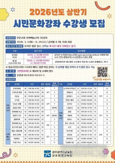 시민행정신문 기자 | 광주시교육청금호평생교육관은 오는 3~6월 ‘2026년 상반기 시민문화강좌’를 운영한다.