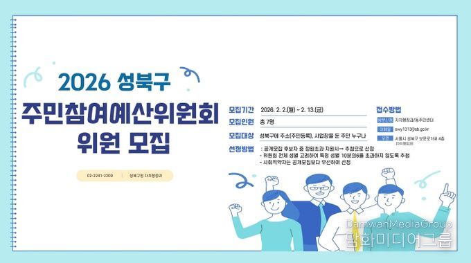 시민행정신문 강갑수 기자 | 서울 성북구가 오는 13일까지 주민 참여를 통한 지역 현안 해결과 재정 민주주의 실현을 위해 2026년 주민참여예산위원회 위원을 공개 모집한다.