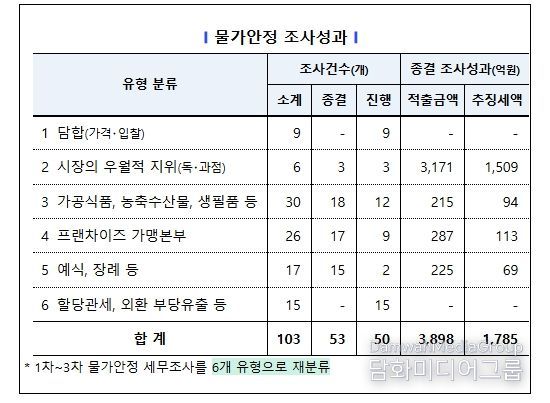 이에 국세청은 ’25.9월부터 ’26.1월까지 3차에 걸쳐, 과도한 가격 인상으로 폭리를 취하며 탈세를 일삼은 담합, 독・과점, 가공식품・생필품 제조, 농축수산물 유통 등 103개 업체에 대해 조사를 실시했으며, ’25.9.25. 착수한 1차 세무조사 결과, 53개를 종결하여 3,898억 원을 적출하고, 1,785억 원을 추징했다.