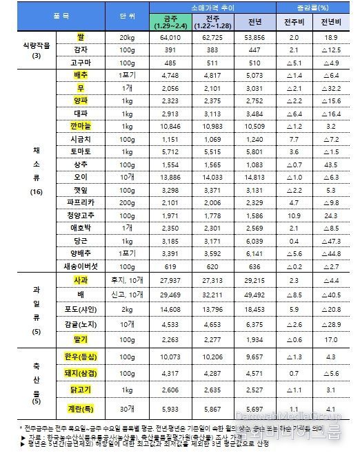 수급 점검 결과 전반적인 설 성수품 가격은 전년 수준으로 비교적 안정적인 흐름을 보이고 있고, 설 차례상 비용도 전년보다 소폭 하락했다. 다만, 대과 위주의 선물용 사과와 지난해 가격이 낮았던 쌀과 한우는 다소 높은 수준을 보이고 있다.