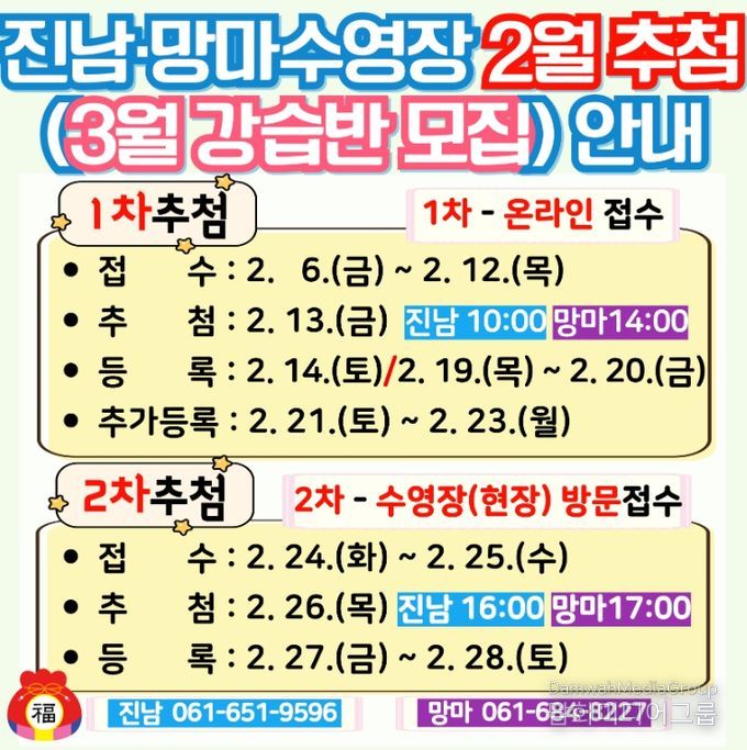진남수영장과 망마수영장은 2월 12일까지, 웅천수영장은 2월 11일까지 3월 강습반 온라인 접수가 가능하며, 1차 추첨 이후 결원 인원에 한해 2차 방문 접수 및 추첨이 진행된다.