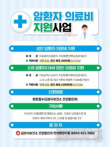 시민행정신문 기자 | 김천시는 암과 희귀질환으로 투병 중인 저소득층 시민들을 위해 '암환자·희귀질환자 의료비 지원사업'을 연중 상시 운영하며 시민 건강 증진에 앞장서고 있다.