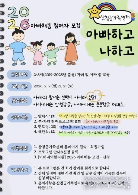 사업 참여 대상은 2~8세(2019~2025년 출생) 자녀를 둔 아빠이며, 21일까지 산청군가족센터 홈페이지를 통해 21일까지 신청할 수 있다.