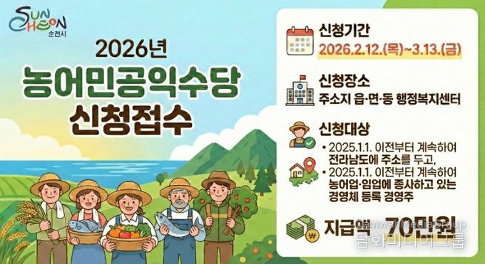 농어민 공익수당은 농어업·임업의 공익적 가치를 강화하고 농어민의 안정적인 경영을 지원하기 위해 순천시와 전라남도가 협력해 지급하는 제도다.