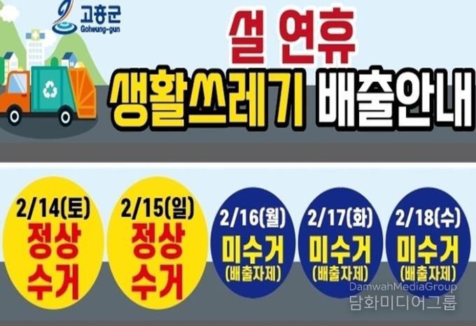 군은 2월 14일부터 15일까지는 설 명절에 발생한 생활폐기물을 정상 수거하며, 이 기간 환경미화원 등 약 100명을 투입해 평소와 같이 안정적인 수거 서비스를 제공할 계획이다.