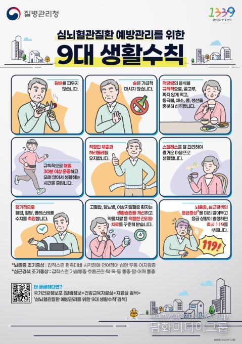 질병관리청은 이같은 내용을 담은 뇌졸중과 심근경색의 위험성과 대응요령에 관한 ‘심뇌혈관질환 예방관리를 위한 9대 수칙’을 마련한 바 있으며, 질병관리청 누리소통망을 통해 홍보콘텐츠를 게시하는 등 뇌졸중과 심근경색을 예방하기 위해 노력하고 있다.