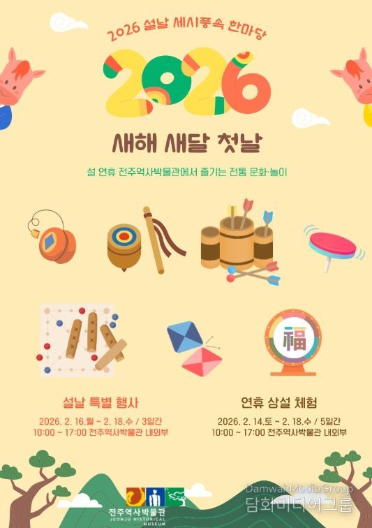 먼저 전주역사박물관은 ‘2026 세시풍속 한마당(설) '새해 첫 달 첫 날'’을 주제로 설 명절의 의미를 되새기고 가족이 함께 즐길 수 있는 다양한 전통 체험 프로그램을 마련했다.