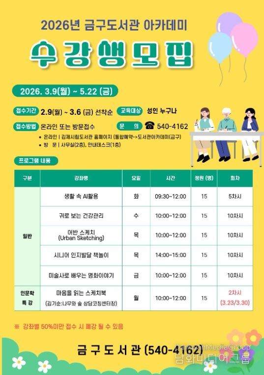 시민행정신문 강갑수 기자 | 김제시 금구도서관은 지역 주민들의 자기 계발과 문화 향유 기회를 확대하기 위해 2026년 금구도서관 아카데미 수강생을 오는 3월 6일까지 선착순 모집한다고 밝혔다.