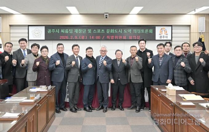 공주시의회는 지난 9일 오후 2시, 의회 특별위원회실에서 좌장을 맡은 이상표 의원과 이준희 대한씨름협회장, ‘씨름의 아이콘’ 김기태 영암군민속씨름단 감독, 손한동 충남씨름협회장, 이일주 공주문화원장 등 대한민국 씨름계와 지역 문화계를 대표하는 거물급 인사들이 머리를 맞대고 ‘공주시 씨름단 재창단 및 문화도시 도약’을 위한 구체적인 해법을 모색했다.