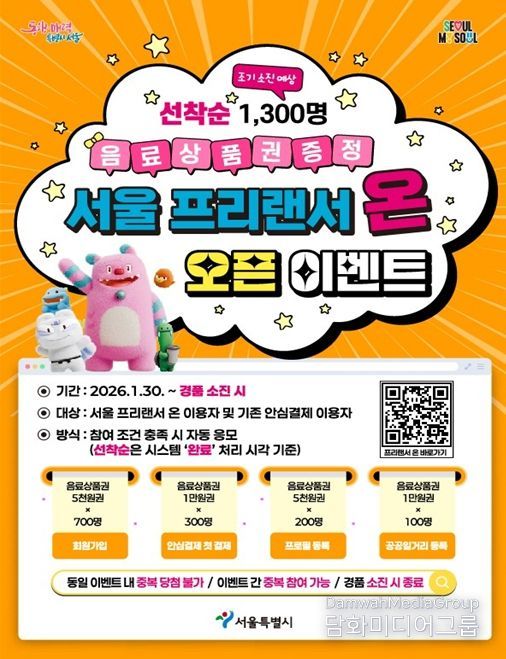 한편, 서울시는 ‘서울 프리랜서 온’의 보다 더 많은 프리랜서와 발주기업의 참여 독려를 위해 1월 30일부터 경품 소진 시까지 이벤트를 진행한다. 회원가입, 첫 결제, 프로필 등록, 공공일거리 등록 시 선착순 1,300명에게 음료 상품권을 제공한다.