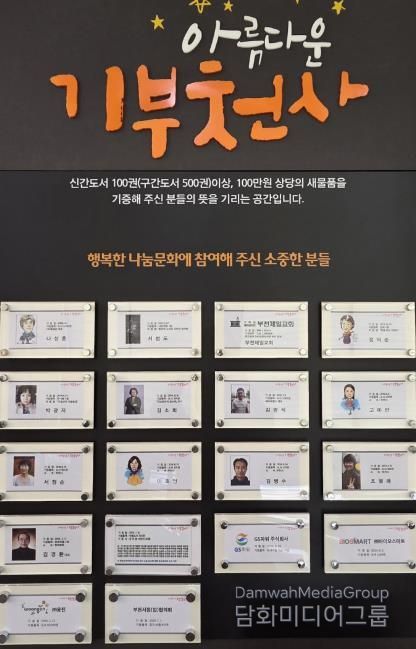 ‘아름다운 기부천사’ 게시판은 상동도서관 1층 로비에 마련돼 시민 누구나 쉽게 볼 수 있도록 조성돼 있다. 특히, 책을 통한 나눔의 가치를 전하고 자발적인 기부 문화를 확산하는 상징적 공간으로 자리매김하고 있다.