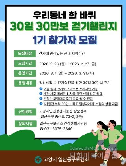 시민행정신문 기자 | 고양특례시 일산동구보건소는 지역 주민의 기초 체력 증진과 신체활동 활성화를 위해 기획한‘우리동네 한 바퀴 30일 30만보 걷기 챌린지’1기 참가자를 오는 23일부터 모집한다.