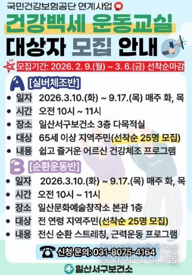 실버체조반은 65세 이상 어르신을 대상으로 일산서구보건소에서, 순환운동반은 전 연령층을 대상으로 일산문화예술창작소에서 각각 운영될 예정이다.