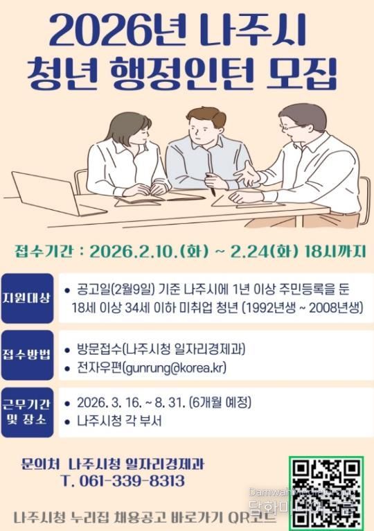 시민행정신문 강갑수 기자 | 전라남도 나주시가 청년들에게 안정적인 행정 실무 경험과 취업 역량을 제공하기 위해 올해 처음으로 청년 행정인턴제를 도입하고 공개 모집에 나섰다.